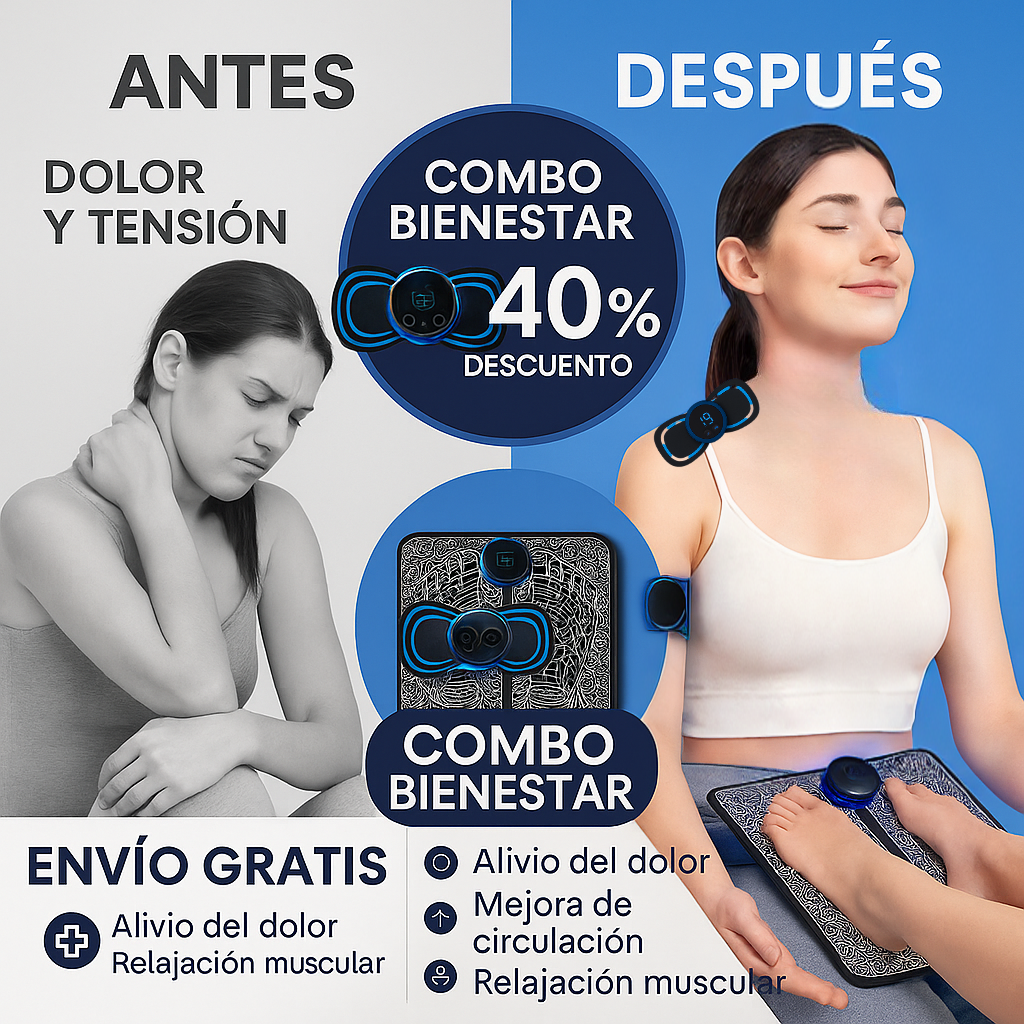 Ambos productos ofrecen múltiples modos e intensidades para que adaptes cada sesión a tus necesidades. Ya sea estrés, dolor muscular o piernas hinchadas, este combo te brinda alivio donde más lo necesitas.